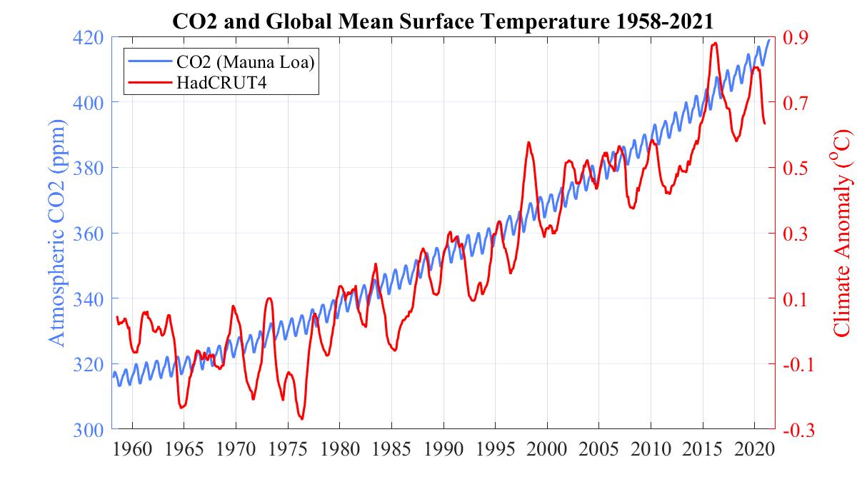 After loading the data for annual HadCRUT4, CO2, and TSI, all for the period 1850-2017, MATLAB then plotted the blue and red curves with the following one-line MATLAB command. plot(1882:1985, [F(HadCRUT4 - 1.85*log2(.003*CO2)) F(0.3*TSI)])