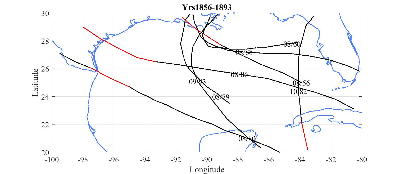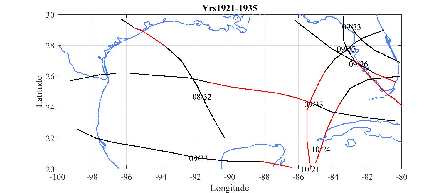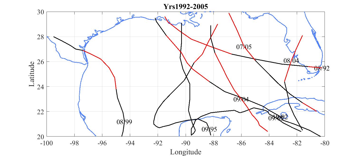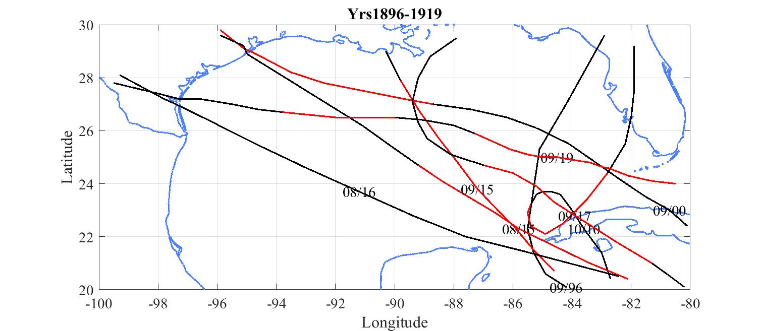 Red tracks are where the hurricane exceeded 120 knots.